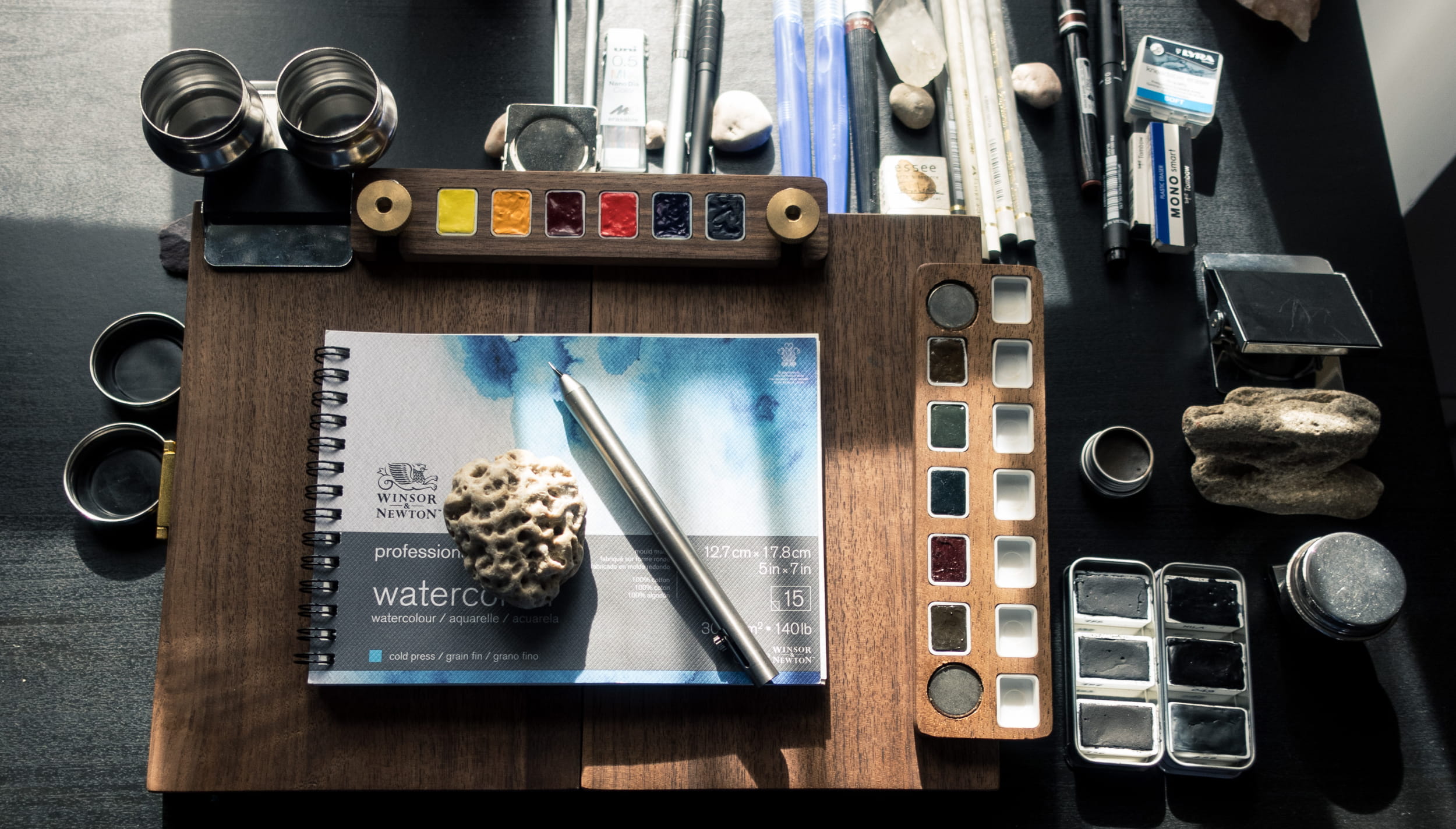 Ti posso già dire che solitamente inserisco pochissimi colori come matite acquerellabili (solitamente blu/verdi/caput mortuum) e grafite acquerellabile nei vari accrocchi. Non ho un brand esclusivo, dipende. Mi piacciono molto le Faber Castell Duhrer, le Technalo Caran d’Ache tonalizzate e le Graphitint Derwent, che però sono un po’ meno reperibili , perciò le porto poco. Amo i monocromo e i colori troppo vivaci non mi piacciono su tutto il foglio.