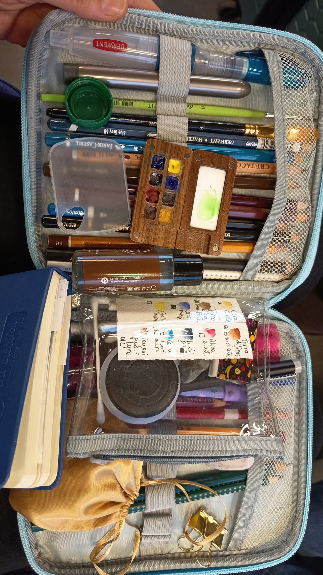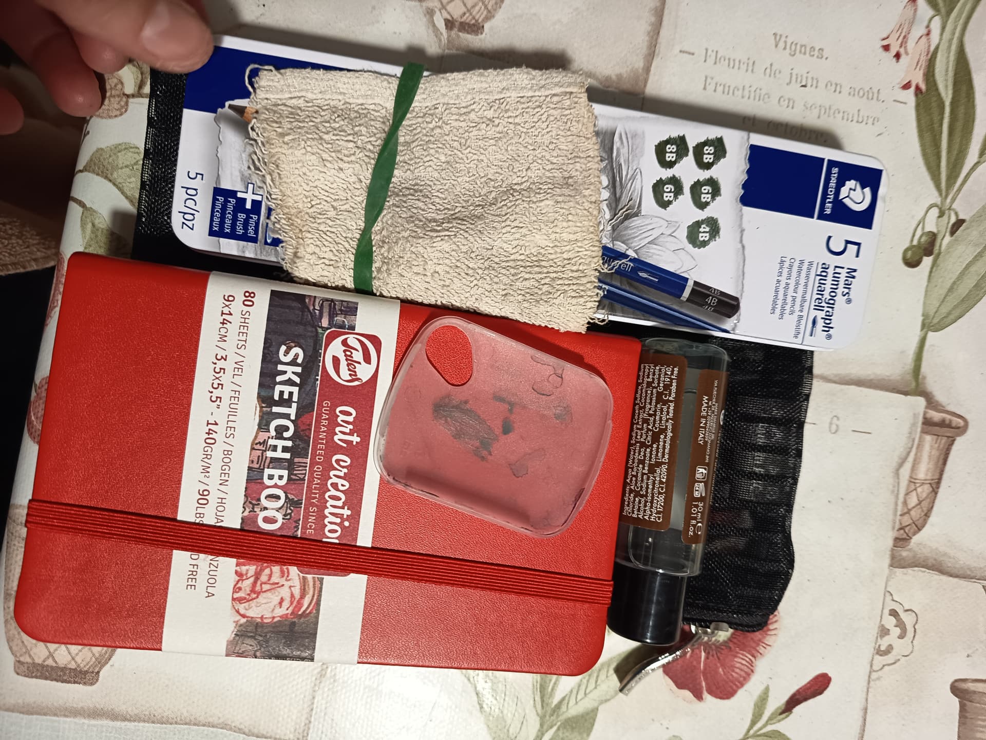 Pennello, grafite normale, grafile acquarellabile Staedler 4b e 8b, colore verde acquarellabile Grip, moncone porpora non acquarellabile, pennello , pezzetto di gomma pane, graffette, asciugamano, boccetta per acqua in in attesa di trovarne una più piccola e vaschetta come tavolozza. A volte prendo un altro minisketch album (rispetto a questo, l’altro è cm 12×12 sempre Art Talens). La busta nera è dei cinesi, a volte inserisco anche un liner.
