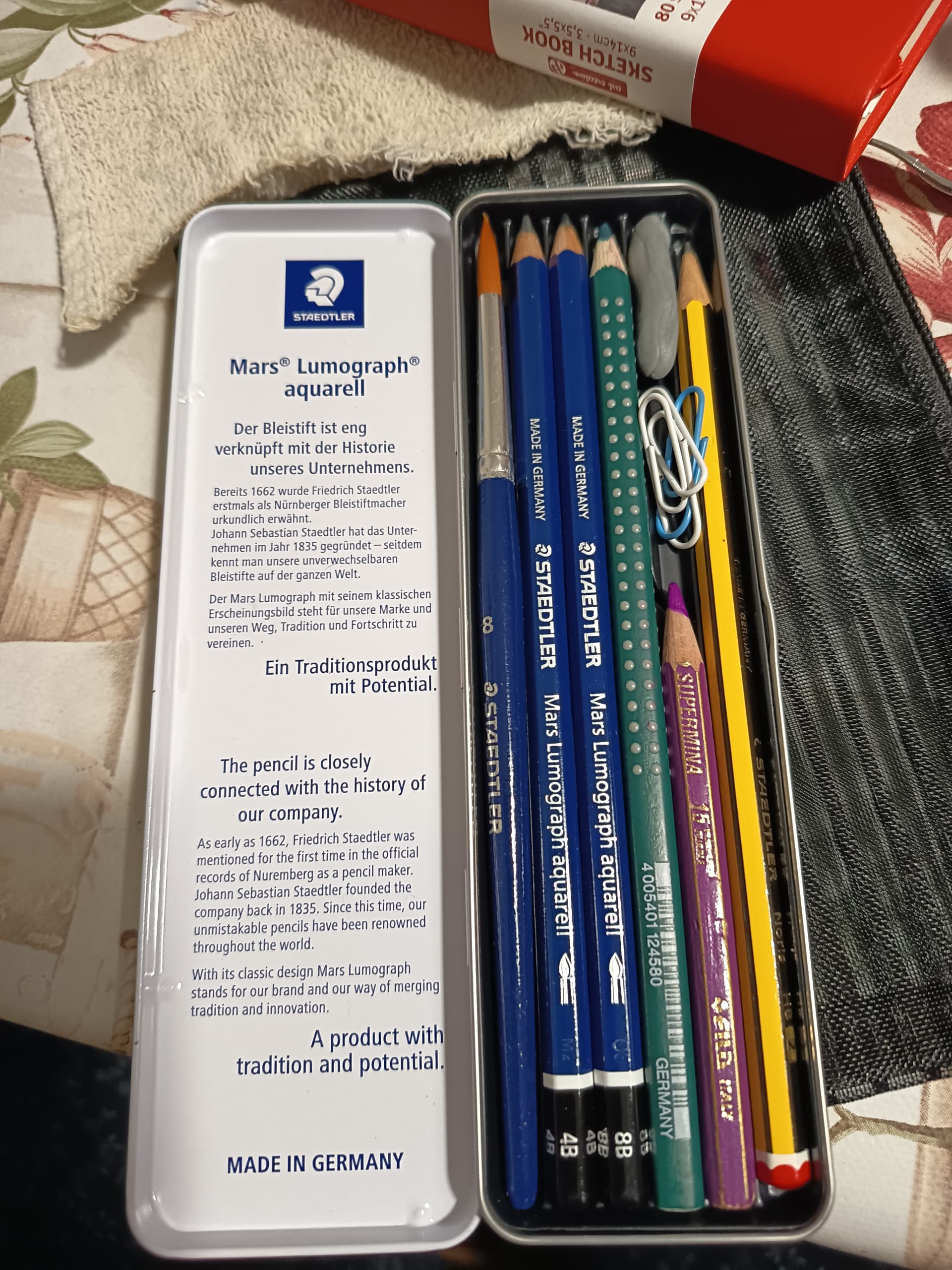 ecco una delle versioni minimal da sketching, una versione che nella borse di tutti i giorni non ingombra e non pesa. Ho altri set simili ma siccome la box è più piatta (quella della grafite Faber Castell Pitt Matt) poi devo tenere la gomma fuori. A volte cambio qualche grafite con un altro colore o con altra grafite opaca non acquarellabile.