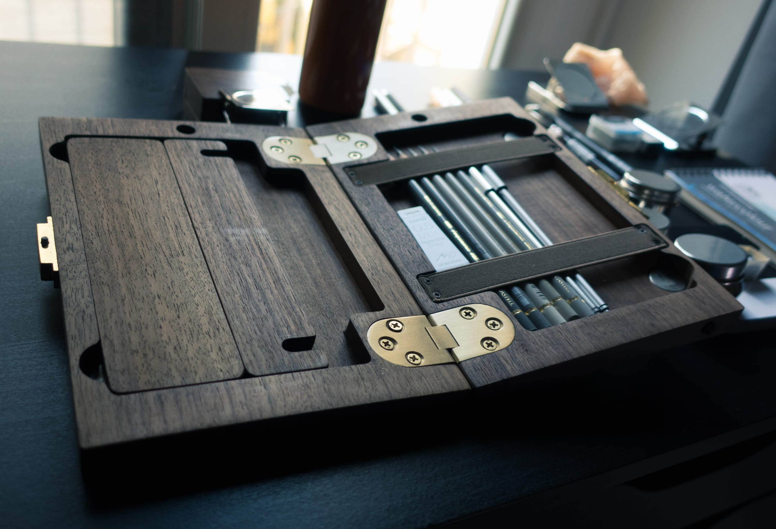Ps. Per una versione leggermente meno minimal, il box piccolo di latta Caran D’Ache è una buona soluzione (perché ha la gommapiuma sottile e riesce a contenere 3-4 pezzi in più all’interno, magari pure un temperino piccolo).