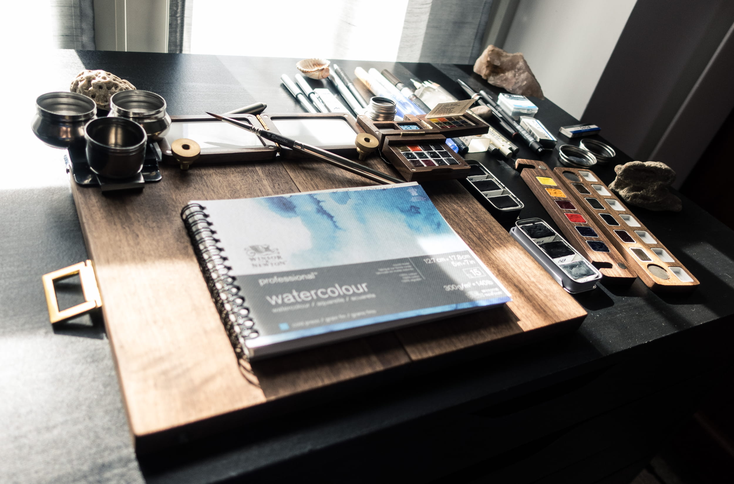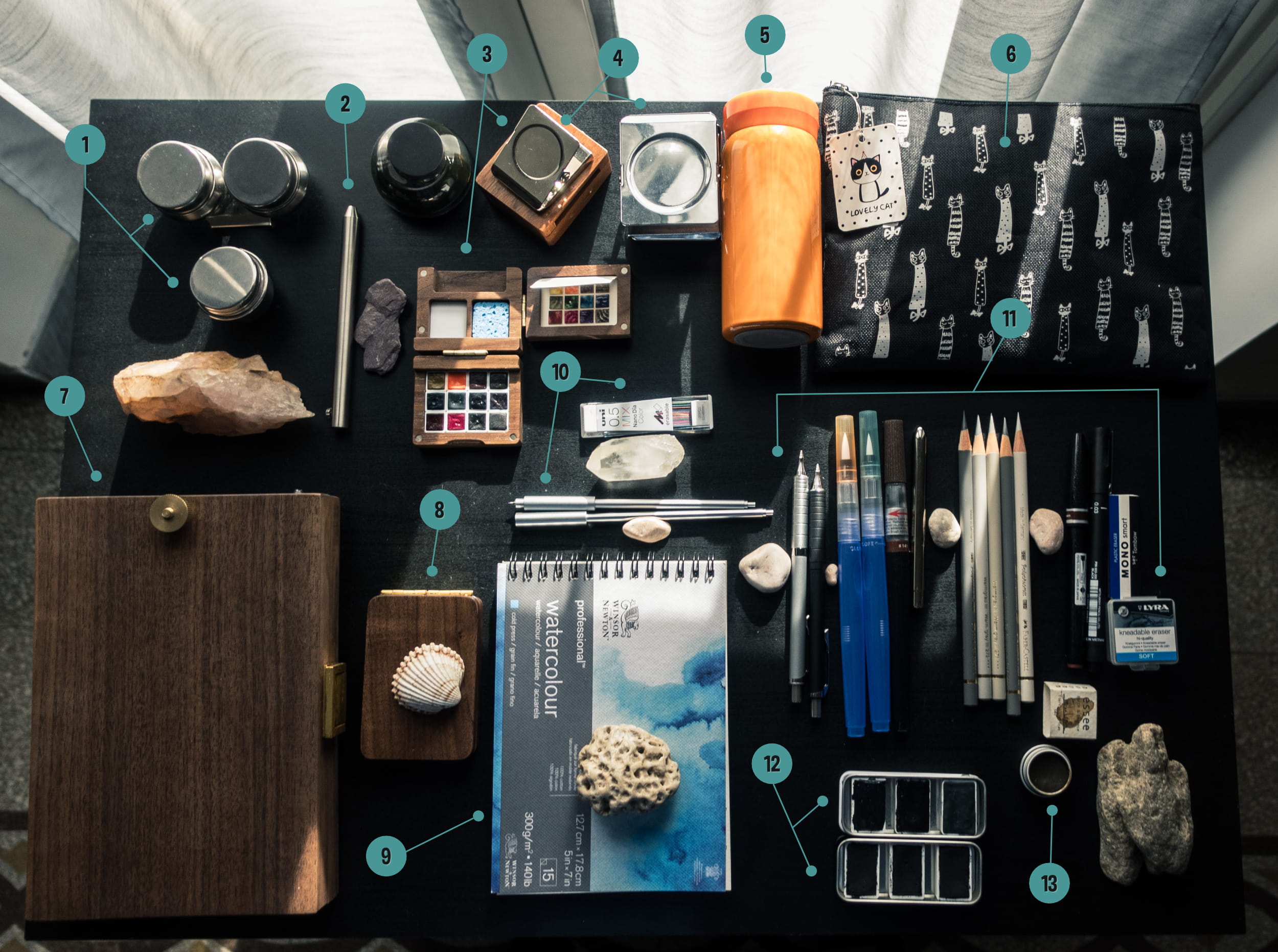 Pubblico l’accrocco medio da viaggio/sketching, molto minimal e funzionale (almeno per me che mi sposto coi mezzi pubblici). Ne ho preparati altri due, uno ancora più minimal e uno più grande.