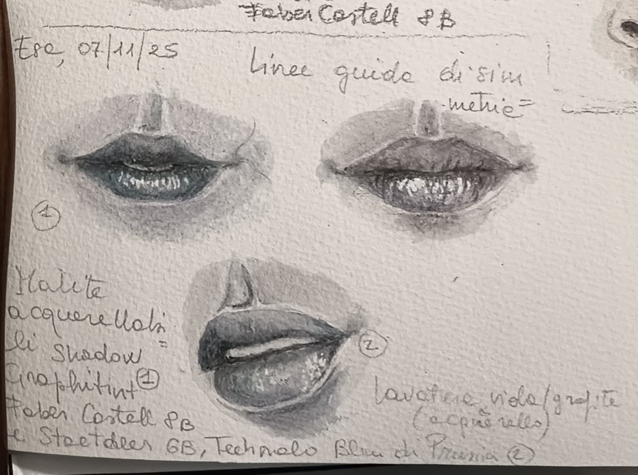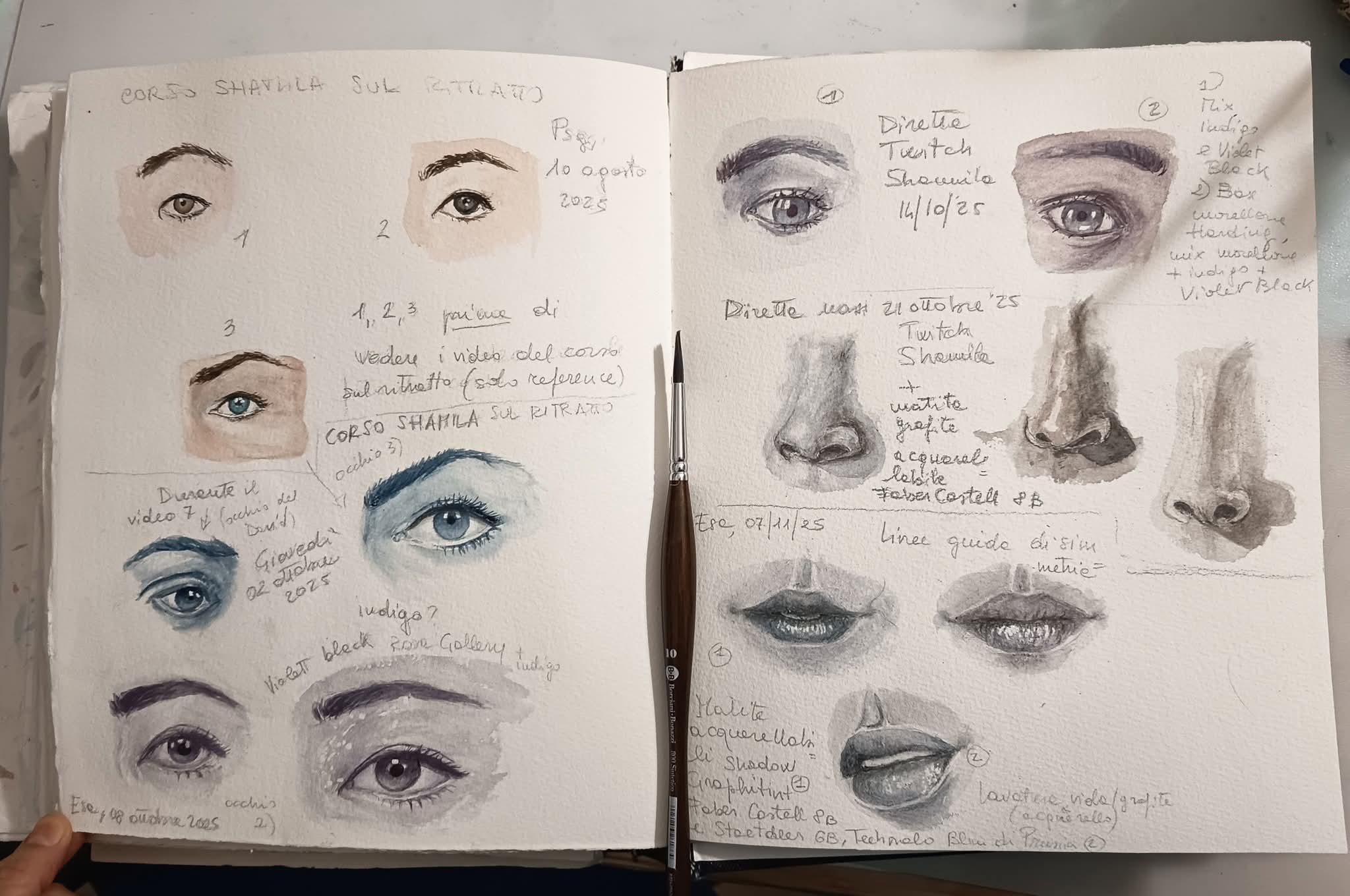 Oggi mi sono esercitata a disegnare bocche guardando il corso di Shamila. I primi tre occhi li ho disegnati prima del corso.