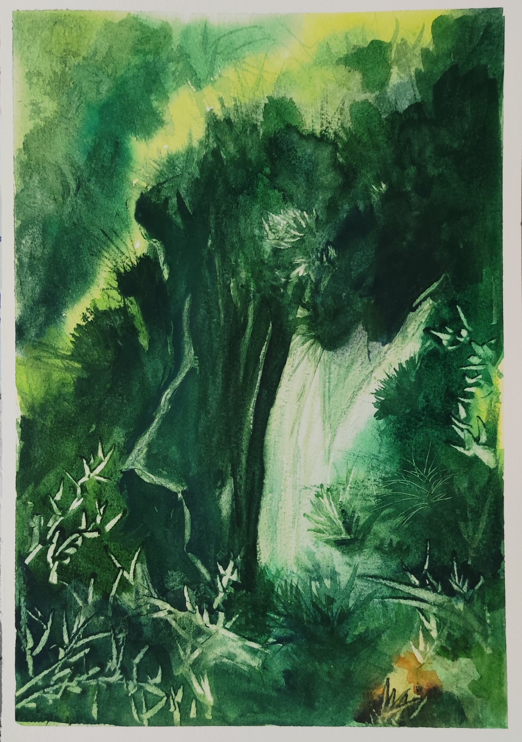 Ecco il mio esercizio di oggi. Non somiglia molto a una cascata, ma mi piace lo stesso Direi che sembra più un bosco