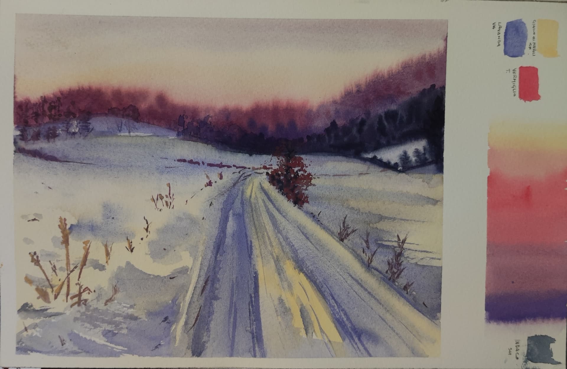Arianna ha usato i tre colori primari, io ho usato il lavanda al posto del blu, ma ho dovuto aggiungere l’indaco per gli scuri.