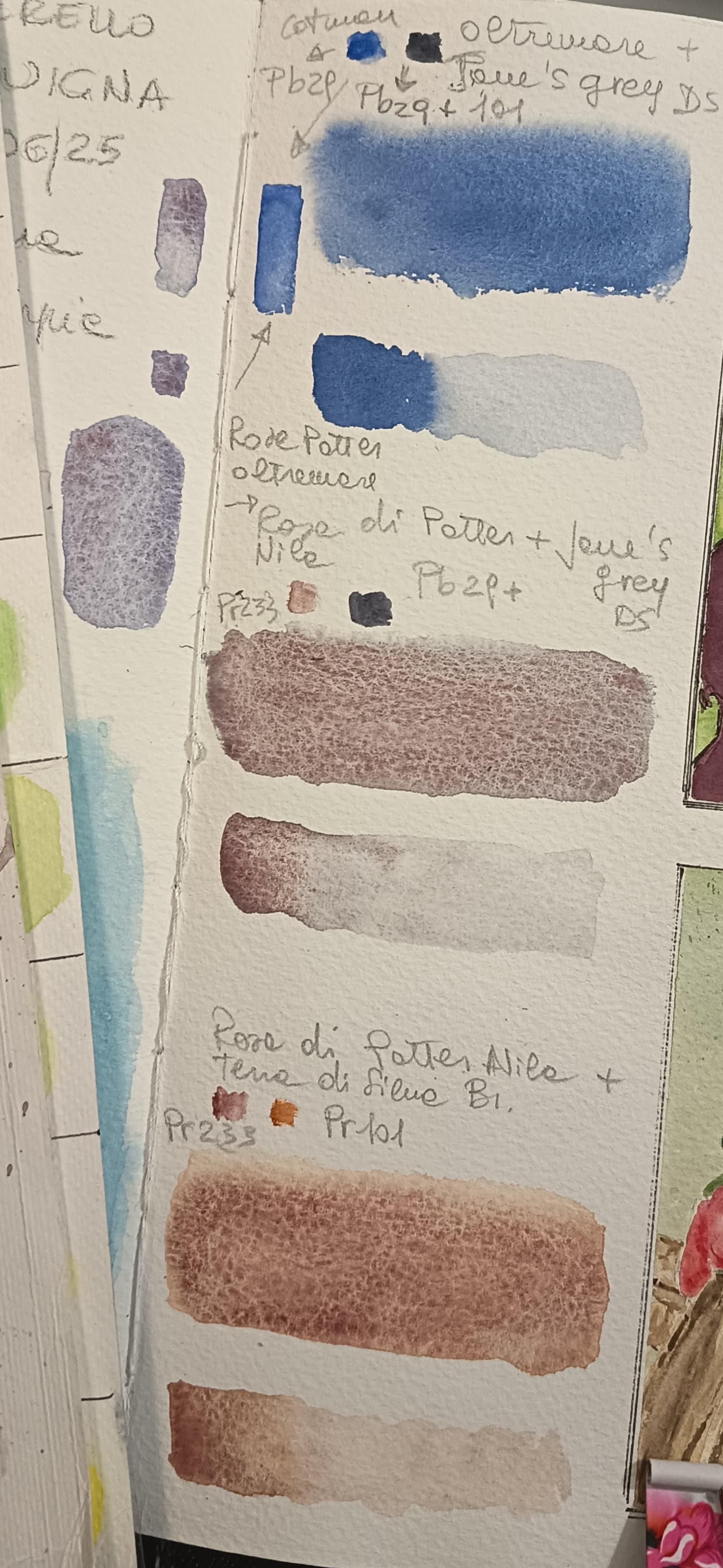 In particolare, ho provato mix di oltremare (che differenza c’è con oltremare francese?) , rosa di potter e Terra di Siena Bruciata , che non granula. Il blu di Prussia e il marrone Van Dick li sto aspettando.